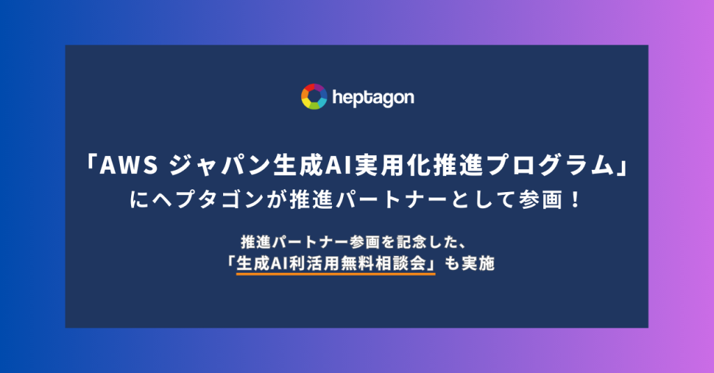 地域課題は地域企業が解決する「ビジネスの地産地消」のもと、青森を拠点に企業の事業開発・支援を行う株式会社ヘプタゴン(所在地:青森県三沢市、代表取締役社長:立花拓也、以下 ヘプタゴン)は、アマゾン ウェブ サービス ジャパン合同会社 (以下 AWS ジャパン) が2024年7月22日から開始した「AWS ジャパン生成 AI 実用化推進プログラム」に推進パートナーとして参画したことをお知らせします。