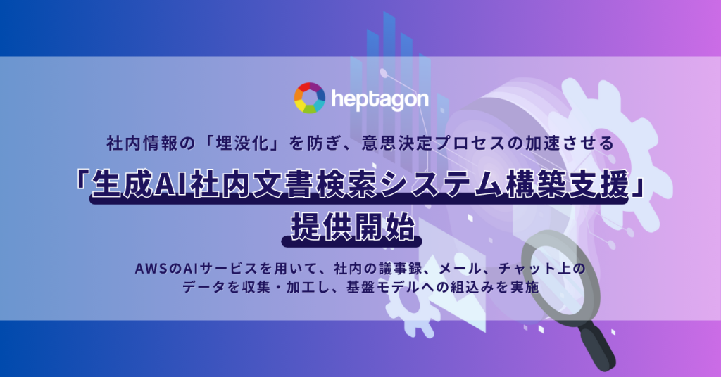 東北を拠点にビジネスの地産地消をテクノロジーで実現する株式会社ヘプタゴン(所在地:青森県三沢市、代表取締役社長:立花拓也、以下 ヘプタゴン)は、企業が直面する経営課題を解決するために「生成 AI 社内文書検索システム構築支援」の提供を開始しました。