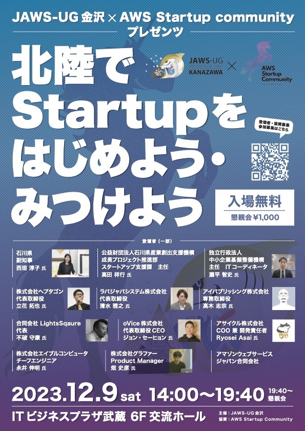 2023年12月9日 (土) に開催される「JAWS-UG 金沢 × AWS Startup Community プレゼンツ『北陸で Startup をはじめよう・みつけよう』」に、弊社代表の立花が登壇します。同イベントのセッションを通じて、地方中小企業における AWS 導入事例や活用のポイント、地方エンジニアと IT コミュニティとの関わり方を紹介する予定です。