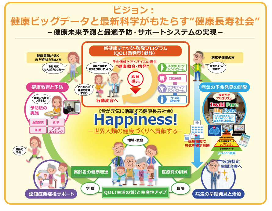 弘前大学COIでは、青森県が抱える課題である短命県返上と健康寿命延伸に取り組むために、十数年前より実施されている大規模住民健康調査「岩木健康増進プロジェクト健診」で蓄積されたビックデータを活用し社会実装へ向けての研究開発に取り組まれています。