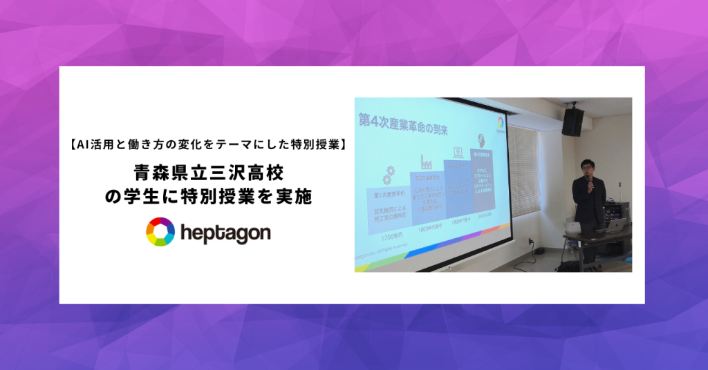 ヘプタゴンは「ビジネスの地産地消」をビジョンに掲げ、地域の課題を地域の企業自ら世界水準のテクノロジーで解決できる世界を目指し、東北を中心に100社300プロジェクトを超える課題解決およびその支援を行ってきました。今回の特別授業では、当社が支援した地域課題の解決事例を交えながら、人工知能 (AI) の発達やそれに伴う働き方の変化など、授業へ参加した学生に対してこれからの未来を生き抜くためのヒントを紹介しています。