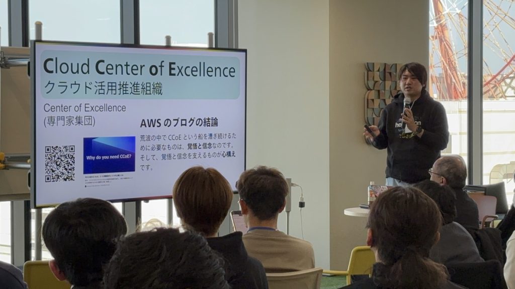 当社からはクラウドアーキテクトの三浦 一樹が登壇しました。AWS re:invent 2024 参加時にバッファローチキン早食い大会へ参加したというアイスブレイクから始まり、ヘプタゴンが目指している ”地域の CCoE” についての説明と、当社が手がけた地方での事例について発表を行いました。