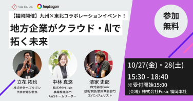 セミナー 東北×九州コラボレーション!「地方企業がクラウド、AIで拓く未来」(Day1) 開催日時 2023.10.27 15:30 〜 19:00 無料 株式会社 Fusic (福岡県福岡市中央区天神4-1-7 第3明星ビル6F) 受付終了