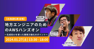 ハンズオン 【札幌開催】地方エンジニアのためのAWSハンズオン 〜生成系AIを使った開発力強化のポイント〜 #クラウド#生成系AI#AWS 開催日時 2024.1.27 13:30 〜 18:00 無料 NECソリューションイノベータ株式会社 北海道支社 受付終了