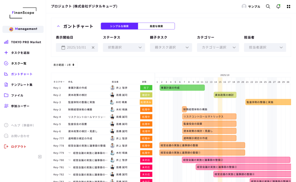 もう一つの主力サービスFinanScope Managementは、上場準備に必要なすべてのタスクの期限や担当者をクラウド上で管理して、コミュニケーションが取れます。企業が上場準備を進めるなかで直面する証券会社とのメール+ Excel などの煩雑なやり取りや進捗管理に費やす膨大な時間や工数の削減を目的として作られました。