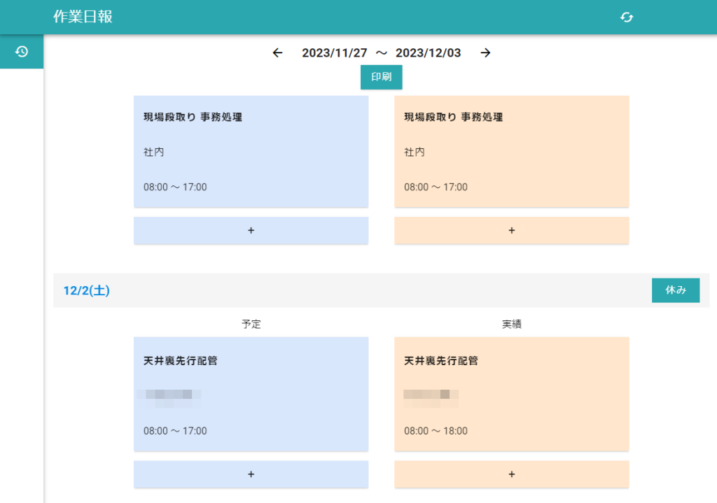 工事原価計算は、工事現場へ赴く社員から、労働時間と各物件の工事番号(自社のデータベースに入っている受注番号)を日報で提出してもらう必要があります。以前の日報は、各部署規定の定型用紙に記入、FAX で提出するといった流れでした。現場作業員の記入の手間と FAX の提出による遅延、総務の日報確認と処理に費やす残業時間は大きな課題です。