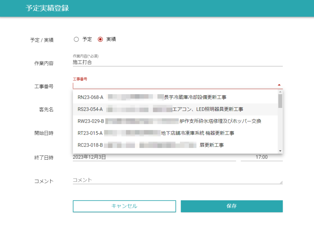 特に現場作業員の日報記入の負担を下げるために、シンプルな操作画面にしています。記入者は日時・労働時間・工事番号などをプルダウンメニューで選択するだけで入力可能です。工事番号は、自社のデータベースと紐づいているので、番号に間違いが起きません。